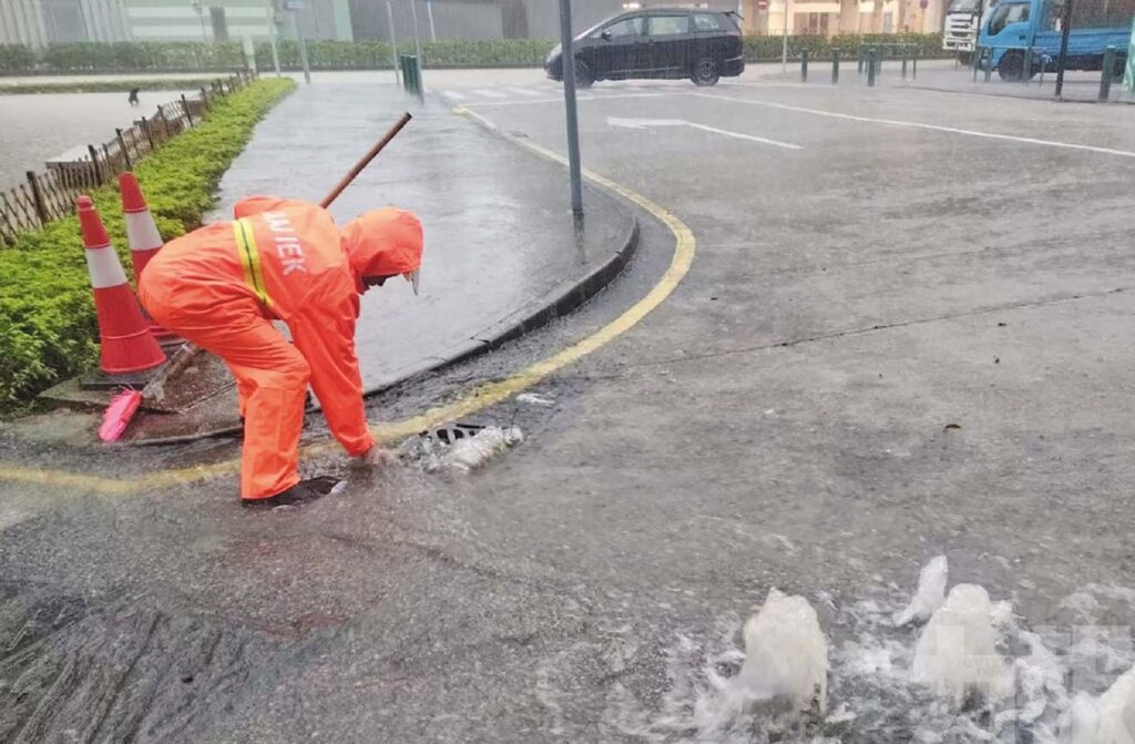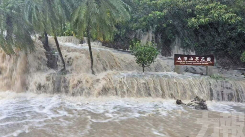 市政署表示,持續特大暴雨及潮漲,令多個低窪地區均出現水浸情況,暴雨主要集中在路氹區,氹仔菜園路、偉龍馬路、松樹尾、黑橋街、石排灣圓形地以及路環舊城區等水浸較嚴重。